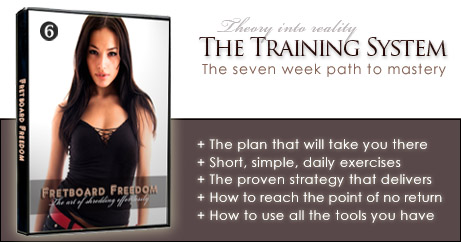 ![]() | ![]() | The tool that makes it all easy and fun In this video I'm going to give you a complete seven week plan that you can follow one day at a time. It's easy, simple and fun. Having a plan means being serious about getting results - and this system of training and development is the recipe you need to get to where you want to go. I'm going to lay out the exercises and tools that you need to use every day, so that the road to fretboard freedom is laid out nicely in front of you. The entire program is centered around this plan and all the strategies, tools and exercises come together into this easy to follow seven week process. In the next video I will guide you through this process each day: |