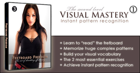 ![]() | ![]() | Develop the amazing skill of instant pattern recognition There's a huge difference between knowing the patterns on the fretboard and mastering them. When you know them, you have to think in order to visualize them - but when you master them, you just see them. In fact, you can't not see them anymore. It's like trying to look at this word: "house" and not read the word. Can you see the letters without also reading them? Of course not. Imagine if you could not look at the fretboard without also visualizing the scale patterns. That's visual mastery and it can be yours now. In this video I'll also give you 2 essential exercises that will take you no more than a couple of minutes to go through each day. But if you practice them for a month, they'll revolutionize your visualizing abilities guaranteed! |