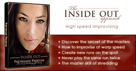 ![]() | ![]() | The best hidden secret of the pros This video contains an amazing technique that you can use to create runs and licks on the spot. It will take your playing from 2D to 3D in very little time. In 30 minutes I will show you how to construct a run in such a way that you can use it to improvise at maximum speed. Actually it's not a run but a 3 dimensional ever changing burst of notes that you can build on for ever. I've never seen or heard of a similar way of approaching fast improvising. This method is a gigantic short cut to the ultimate experience of control and power when you solo. If anyone had presented this method to me when I started playing guitar I would gladly have sold my dear mother to get a hold of it (Sorry mom) |