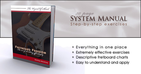 ![]() | ![]() | Everything in one place - The system manual The system manual collects all the exercises and tools into one complete tool that you can bring with you where ever you go. Use it to practice with or without your guitar. Do visualization exercises, look up any pattern you need to and exercises your nervous system in your car, at work or any other place. This manual isn't just a collection of information. It contains exercises that you can do with a pen and paper and some that you can do without having access to anything but your mind. This gives you more options and allows you to practice many times throughout the day - and it makes it possible for you to reengage all the information you got from the videos, quickly and easily. |