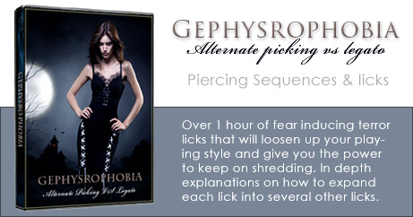 ![]() | ![]() | Alternate picking and legato licks and runs Loosen up your playing with these powerful and extremely convincing licks. Everything is explained in detail right there on the screen. No need to spell your way through complex tablatures. The video is packed with licks that mix alternate picking and legato technique. Mixing the two techniques allows you to achieve a fluent and relaxed playing style and you'll develop more variety in the sounds you produce. Running time 1:10 [Gephysrophobia: An abnormal and persistent fear of crossing bridges] |