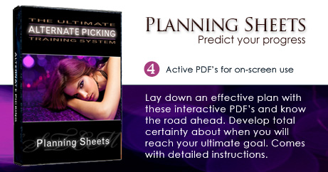 ![]() | ![]() | Crucial feedback can accelerate your progress When you've been using this system for four weeks total. You have the unique opportunity to record and submit a video of you using your alternate picking skills. When you download the Ultimate Alternate Picking System you'll get specific instructions on how to do this. You'll also receive a questionnaire that you fill out and send directly to me (Email of course) Within 7 days you'll receive a three page personal report on your picking technique. This will provide you with important feedback that you can use to chart the final course to your destination. |