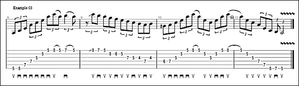 The third example is a little more colorful. Now spend some time with each arpeggio pattern, coming up with licks that integrate the pattern with it's surrounding A-Minor scale.