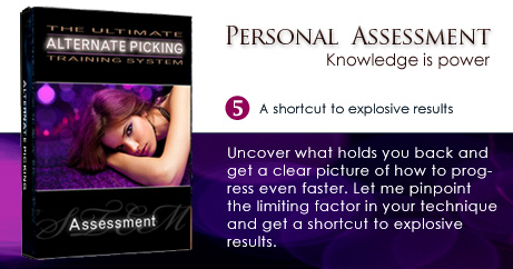 ![]() | ![]() | Crucial feedback can accelerate your progress When you've been using this system for four weeks total. You have the unique opportunity to record and submit a video of you using your alternate picking skills. When you download the Ultimate Alternate Picking System you'll get specific instructions on how to do this. You'll also receive a questionnaire that you fill out and send directly to me (Email of course) Within 7 days you'll receive a three page personal report on your picking technique. This will provide you with important feedback that you can use to chart the final course to your destination. |